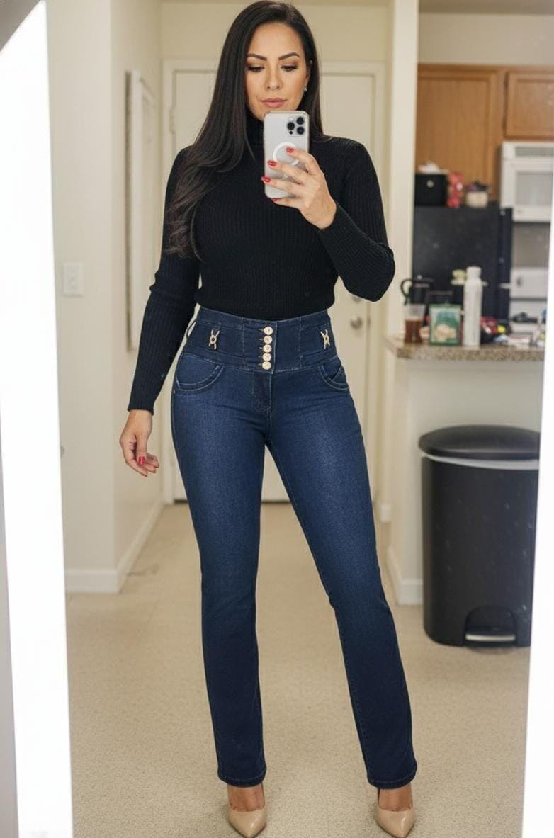 This ICLEER style is a sophisticated dark-wash straight-leg jean featuring a premium ultra-stretch fit and a luxurious soft-touch finish. They are 100% made in Colombia 🇨🇴 with an exclusive design built to enhance your figure. Crafted from a high-quality denim blend, they feature our signature "Piel de Durazno" (Peach Skin) finish, a sleek pocketless back, and elegant gold-toned waistband hardware.