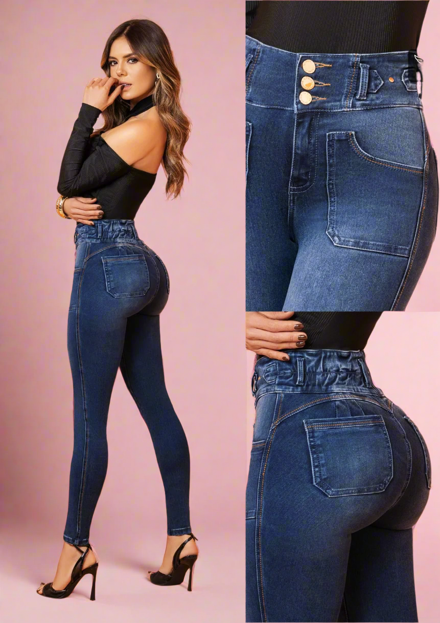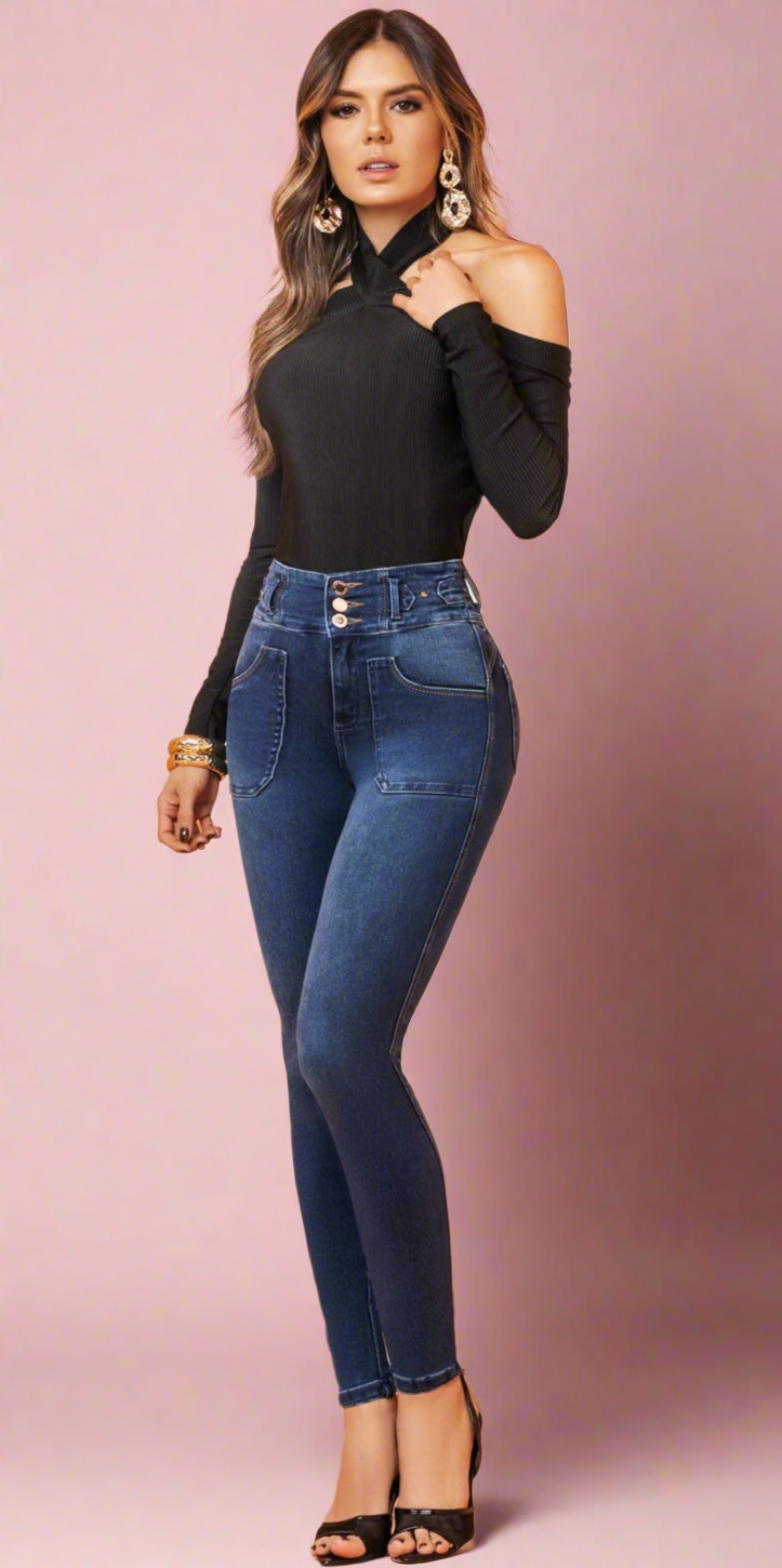 This Style 1503 is a classic medium-dark blue skinny jean with an ultra-stretch fit, 100% made in Colombia with an exclusive design. Crafted from premium denim, they feature a "Piel de Durazno" (Peach Skin) finish for an incredibly soft touch, along with a built-in tummy control panty and functional front and back pockets. This style also has a unique padded back waistband for extra comfort and lift. 💖