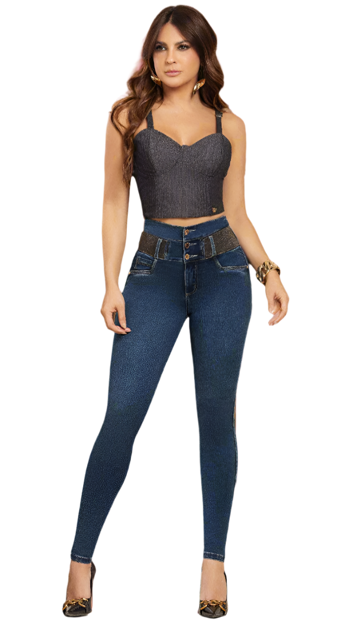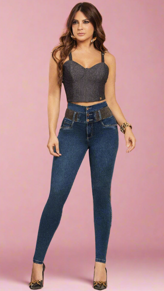 Style 1486 is a chic dark blue high-waist skinny jean, 100% made in Colombia with a very exclusive design. Crafted from 75% Cotton, 23% Polyester, and 2% Spandex, they feature a "Piel de Durazno" (Peach Skin) finish for an incredibly soft touch, plus built-in tummy control. 💖